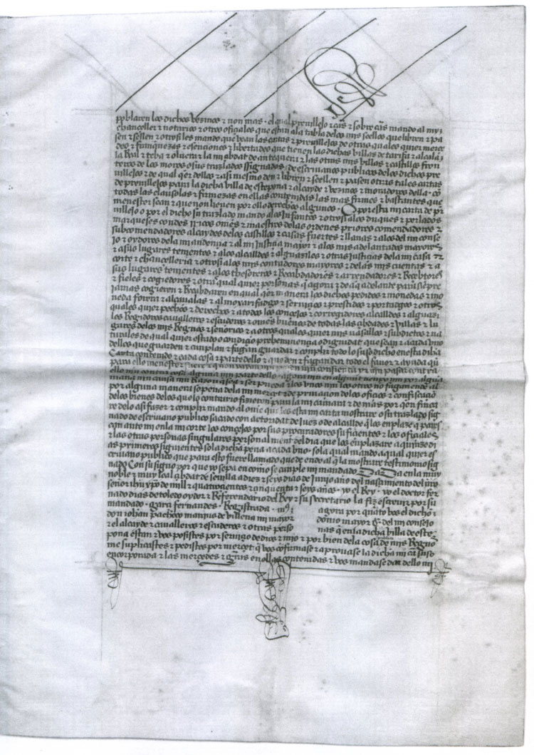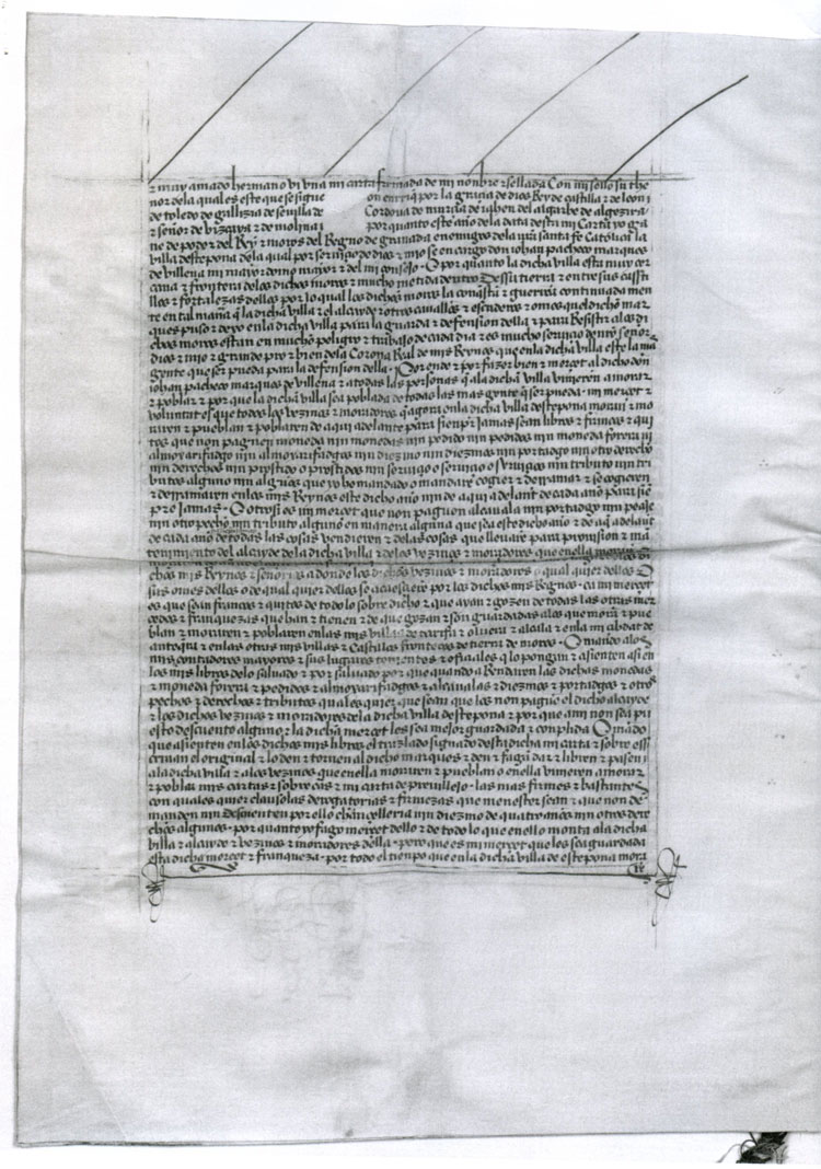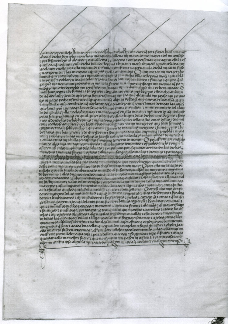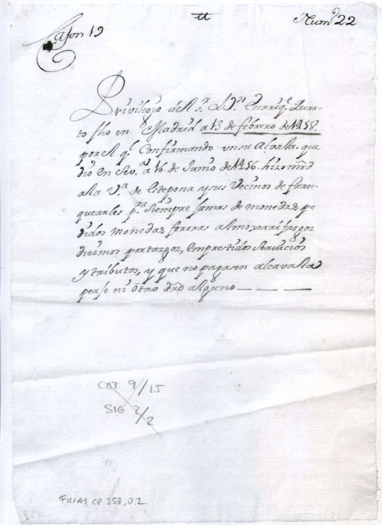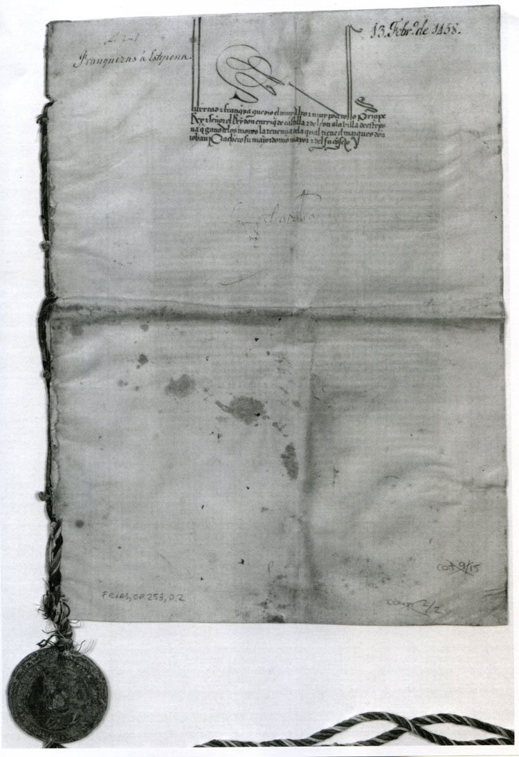 Seccion Nobleza del Archivo Histórico Nacional, Privilegio de Estepona Frias, CP 253, D.2 Privilegio del Señor Don Enrrique Quarto fecho en Madrid a 13 de febrero de 1458. por el que confirmando un su alvala que dio en Sevilla a 16. de Junio de 1456. hizo merced a la Villa de Estepona y sus vecinos de franquearles para siempre jamas de monedas pedidos monedas foreras almoxarifazgos diezmos portazgos, emprestidos servicios y tributos, y que no pagasen alcavala peaje ni otro derecho alguno. Libertad e franqueza que dio el muy alto e poderosso Prinçipe Rey e Señor el Rey Don Enrrique de Castilla e de Leon a la Villa de Estepona que gano de los moros la tenençia de la qual tiene el marques don Johan Pacheco su mayordomo mayor y del su consejo. Padre e Fijo e Espiritu Santo que son tres personas e una essençia divina que bive et Reyna por siempre jamas e de la gloriosa e bienaventurada Virgen Santa Maria su madre a quien yo tengo por Señora e por abogada en todos mis fechos e menesteres e del glorioso e bienaventurado apostol Señor Santiago luz e espejo de las Españas Cabdillo e patron e guiador de los Reyes dellas e de los otros Santos e Santas de la corte çelestial e segunt la verdadera escriptura en el prinçipio crio Dios el çielo e la tierra e todas las cosas que en el son e la mas prinçipal cosa que en el mundo crio fue el ome e al comienço del mundo entre los omes non avia distinçion alguna de mayoria mas todos eran yguales mas fizo los corazones de los omes diversos e asi fueron las voluntades diversas por cuya diversidat començaron a se adversar e discordar unos con otros e començaron peleas e batallas e guerras e dividieron entre si las tierras e començaron a conosçer cada uno lo suyo e lo ajeno e constreñidos por neçesidat porque todas las cosas han menester cabeça e mayor que las rrija e govierne elligieron a Reyes entre si e despues de ellegidos vinieron Reyes por subçesion. Otrosi los Reyes Catolicos deven siempre trabajar porque las guerras que començaren sean justas e liçitas e non puede ser guera mas justa que la que se faze por defension de la Santa Fee Catolica e de su tierra e por recobrar la tierra perdida e porque en tienpo antiguo el Rey don Rodrigo perdio la tierra que oy poseen los moros del Regno de Granada enemigos de la nuestra Santa Fee Catolica. Por esta causa los gloriosos e bienaventurados Reyes de Castilla e de Leon mis progenitores continuaron siempre guerra contra los dichos moros e porque siempre fue mi deseo de paresçer a los dichos Reyes e de enyalçar la Fee Catolica e pugnar por ello fasta poner la sangre e el anima e de defender estos mis rreynos e recobrar la tierra que en tienpo antiguo los dichos moros ganaron por tanto en el comienço [de mi reg……………………los dichos moros del dicho Regno de Granada] e en el segundo año gane dellos la villa de Estepona que es dentro en el dicho Regno çercada de todas partes de grandes çibdades e villas e castillos e fortalezas de moros. Otrosi porque tan grande saber es guardar e defender la tierra de los enemigos como acreçentarla e ganar de nuevo e el alcayde e cavalleros e escuderos e otros omes que agora estan en la dicha villa dEstepona e estaran de aqui adelante son continua guerreados e conquistados de los moros del dicho Regno de Granada e pasan muchos trabajos e lazerias por serviçio de Dios e de la su Santa Fee Catolica e mio e por bien de la cosa publica de mis Regnos e non lo podria sofrir si non fuesen Remunerados e galardonados de grandes nulidades e previllejos segunt que lo son otras çibdades e villas de los mis Regnos que estan en frontera de los dichos moros e de todo previllejo que a los dichos alcaydes e cavalleros e escuderos se de son bien meresçedores e porque el Rey que alguna merçet faze ha de catar en ella que es la merçet que faze e a quien la faze e la causa o rrazon porque la faze e el provecho o el dapno que dello se le puede seguir lo qual todo por mi acatado e por que cunple asi a serviçio de Dios e mio e a bien de la cosa publica de mis Regnos. Otrosi acatados los muchos altos leales señalados serviçios que vos don Johan Pacheco marques de Villena mi mayordomo mayor e del mi consejo fezistes al Rey Don Johan de loable recordaçion mi señor e padre que santo pa[ra]yso aya e avedes fecho a mi e espero que faredes de aqui adelante. Otrosi los que finieron de vuestro lynaje a los gloriosos Reyes mis progenitores donde yo vengo e por fazer bien e merçet al alcayde cavalleros e escuderos e otras personas que agora estan en la dicha Villa de Estepona e estaran de aqui adelante en la defension della para sienpre jamas quiero que sepan por esta mi carta de previllejo rrodado todos los omes que agora son e que seran de aqui adelante como yo Don Enrrique por la graçia de Dios Rey de Castilla de Leon de Toledo de Gallizia de Sevilla de Cordova de Murçia de Jahen del Algarbe de Algezira e Señor de Vizcaya e de Molina. Reynante en uno con la Reyna doña Juana mi muy cara e muy amada muger e con el Infante Don Alfon mi muy caro e muy amado vi una carta firmada de mi nonbre e sellada con un sello su thenor de la qual es este que se sigue Don Enrrique por la graçia de Dios Rey de Castilla e de Leon e de Toledo de Gallizia de Sevilla de Cordova de Murçia de Jahen del Algarbe de Algezira e Señor de Vizcaya e de Molina e por quanto este año de la data desta my Carta yo gane de poder del Rey e moros del Regno de Granada enemigos de la nuestra Santa Fe Catolica la Villa de Estepona de la qual por serviçio de Dios e mio se encargo Don Johan Pacheco marques de Villena mi mayordomo mayor e del mi consejo. Otrosi por quanto la dicha villa esta muy cercana e frontera de los dichos moros e mucho metida dentro dessu tierra e entre sus castillos e fortalezas dellos por lo qual los dichos moros la conquistan e guerrean continuadamente en tal manera que la dicha villa e el alcayde e otros cavalleros e escuderos e omes que el dicho marques puso e dexo en la